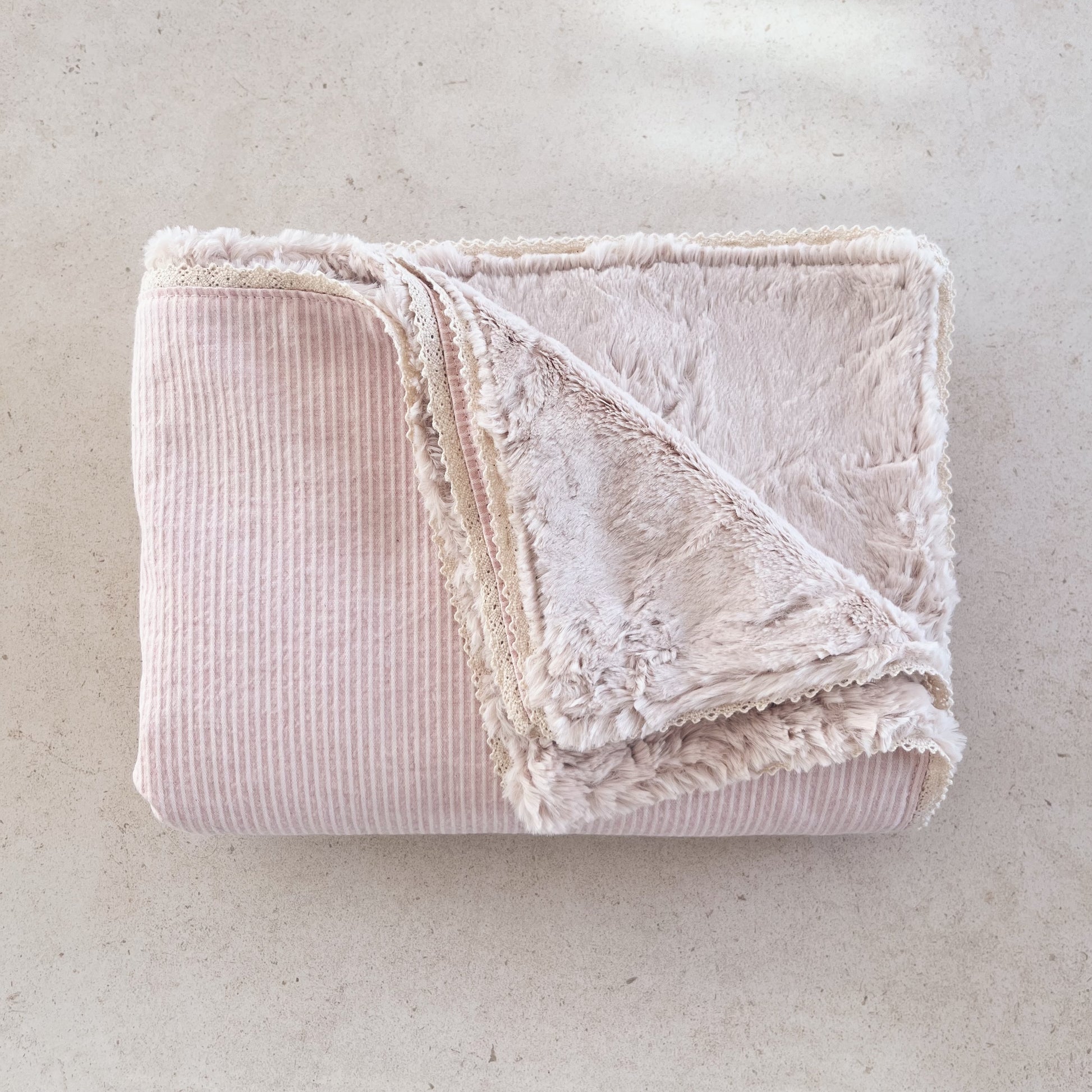 Vous allez certainement adorer cette luxueuse couverture à rayures roses. Doublée d'un riche tissu en fausse fourrure, vos tout-petits en feront assurément leur préférée! La plus petite taille est idéale pour la vie de tous les jours et les ballades hors de la maison, le format moyen est parfait dans le lit de bébé tandis que la très grande couverture pourra servir de literie ou de jeté sur un lit simple. C'est tout simplement LA couverture dont bébé ne pourra plus se passer!